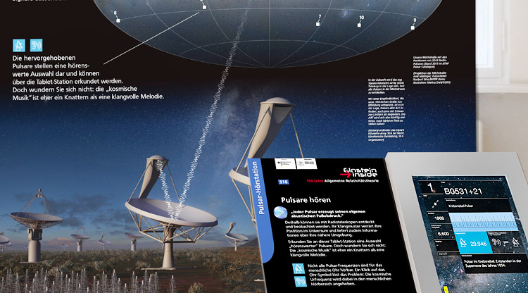 Bei den interaktiven Exponaten waren die Herausforderungen besonders groß. Die darzustellenden Phänomene sind von größter Komplexität und basieren fast ausschließlich auf theoretischen Erkenntnissen. Sie in vereinfachte virtuelle Metaphern, Bildwelten und Funktionen zu übersetzen, verlangte ganz besondere Vorstellungskraft. Ganz besonderen Dank an Prof. Hanns Ruder (+) und Dr. Hans-Peter Nollert vom Institut für theoretische Astrophysik der Uni Tübingen. Gemeinsam fanden wir immer neue Ansätze, diese throretische Welt in interaktive Module zu überführen, die mit einfachster Benutzerführung (UI/UX) in die Welt der Astrophysik entführten.