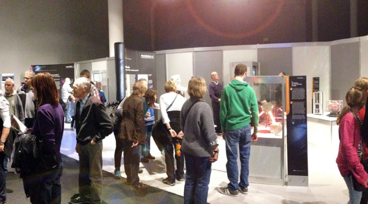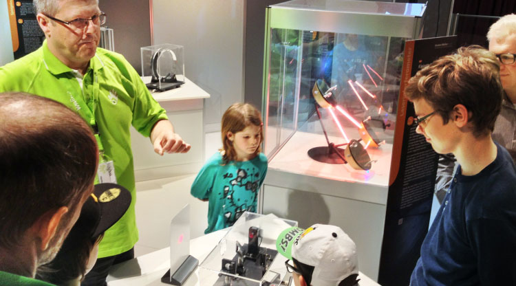 Die interaktiven Highlights: TouchTable mit mit Echtzeit-3D-Modell des Satellitensystems „LISA“, ein Gravitationswellen-Simulator mit 3D-Kinect-Interaktion und das berühmte Einstein-Fahrrad (> Prof. Ruder/Dr. Nollert), das auf eine Fahrt mit Lichtgeschwindigkeit durch die Stadt Tübingen einlädt.